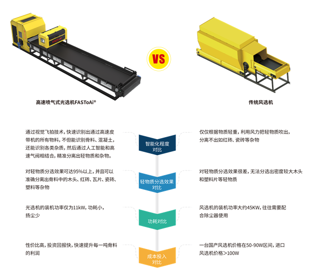 1)以目前國內固廢行業(yè)應用廣泛的高速噴氣式光選機FASToAi®為例,它處理量大,最大處理量可達100噸/小時,最小處理量也可達30-50噸/小時。FASToAi®具有智能識別和自主判斷能力,見多識廣,越用越聰明,不但可以一次性去除再生骨料中幾乎所有雜質,顯著提高再生骨料的純度和經(jīng)濟效益,還可以對裝修垃圾中的輕重物質進行分選,分選效果可達到95%-98%;
