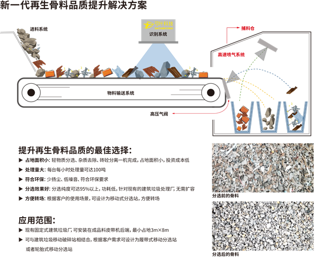 例如,通過傳統(tǒng)機械篩分方式獲得的再生骨料往往夾雜著紅磚、瓦片、木塊、塑料等雜物,不符合再生混凝土的制作標準,使得明明具有較高經(jīng)濟價值的再生骨料,卻因為含雜率高而賣不出好價格。再比如,很多建筑裝修垃圾處置中心采用風選機分離輕重物質,實際操作中,其實很難通過調節(jié)風選機的風量大小來分離輕重物質,導致裝修垃圾中的輕重物質分選不徹底,重物質不能作為再生磚的原材料,往往以每噸幾元的低價售出,最終被拉去墊路,而輕物質由于泥土、金屬、石塊沒有徹底分離,也不能作為RDF的原材料。