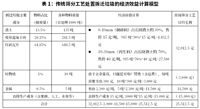 1.1采用傳統(tǒng)篩分工藝處置1000噸拆遷垃圾所產生的日均經(jīng)濟效益