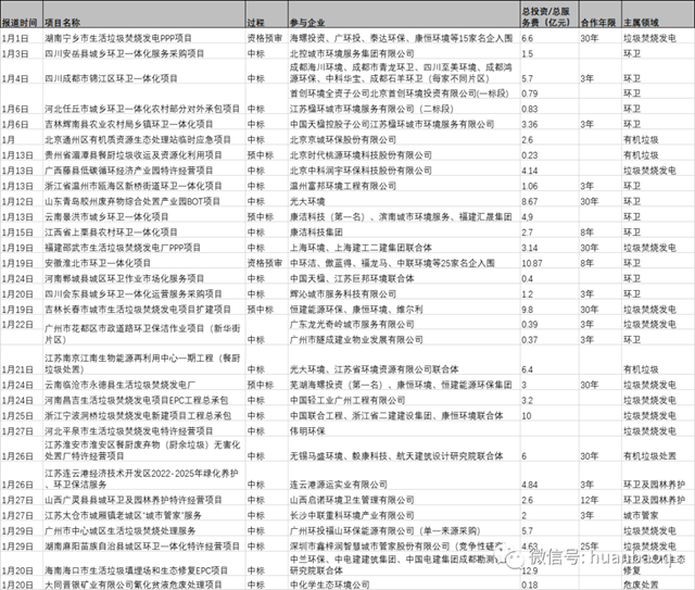 1月,固廢市場共釋放出垃圾焚燒項目11個,涉及投資額超過50億。