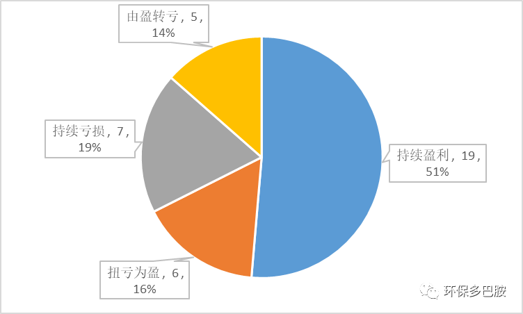 總的來看,總計37家上市公司提前交卷,其中持續(xù)盈利19家,扭虧為盈6家,持續(xù)虧損7家,由盈轉(zhuǎn)虧5家。按照160家環(huán)保上市公司樣本數(shù)量統(tǒng)計,