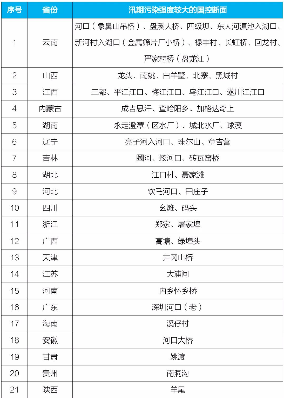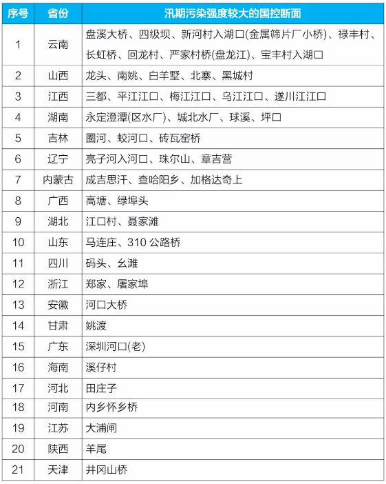 ▼2021年1-10月汛期污染強度較大的國控斷面清單。圖片來源:生態(tài)環(huán)境部