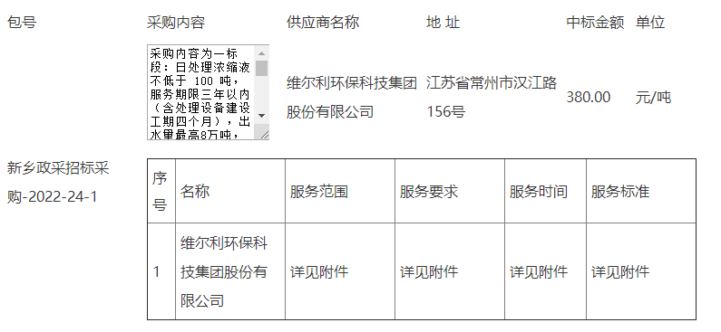 日前,中國(guó)政府采購(gòu)網(wǎng)發(fā)布新鄉(xiāng)市環(huán)境衛(wèi)生管理處新鄉(xiāng)市垃圾無害化處理場(chǎng)濃縮液處理項(xiàng)目結(jié)果公告,維爾利環(huán)保科技集團(tuán)股份有限公司以380元/噸的價(jià)格中標(biāo)該項(xiàng)目。
