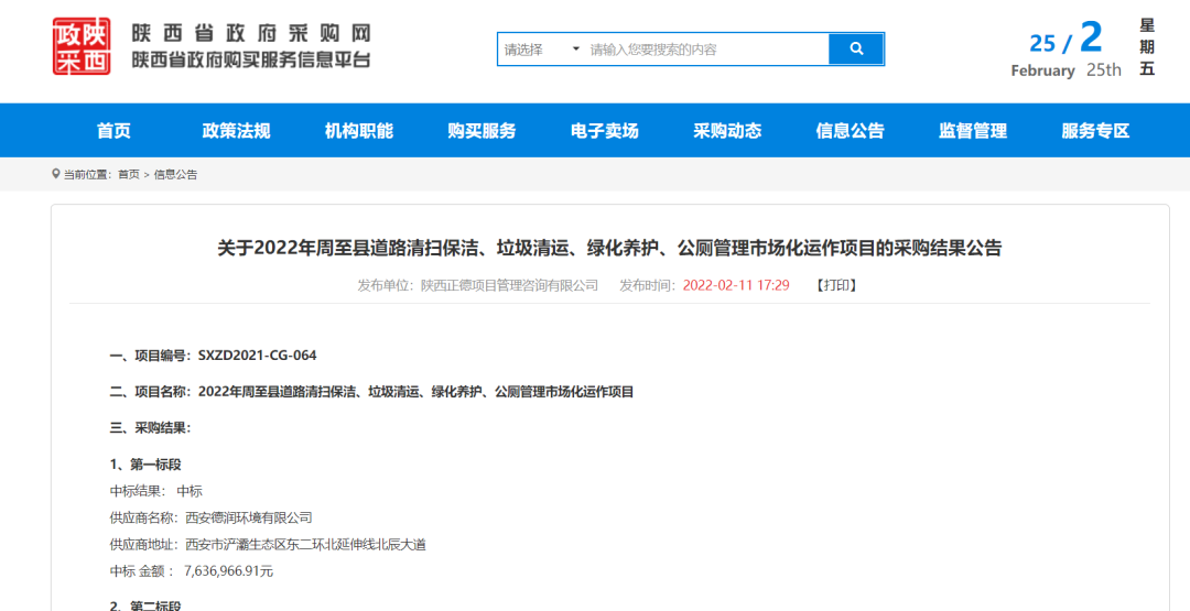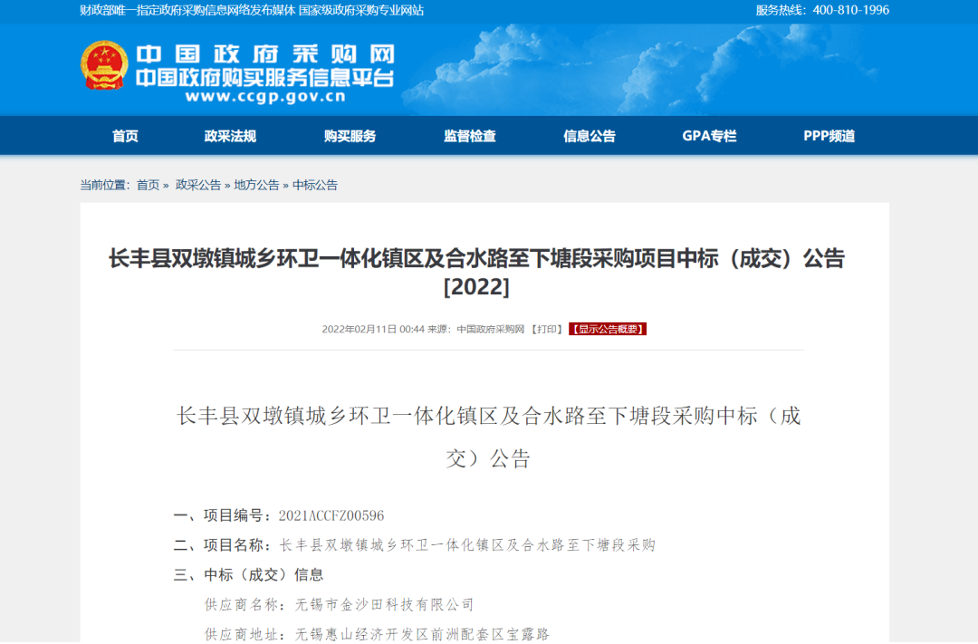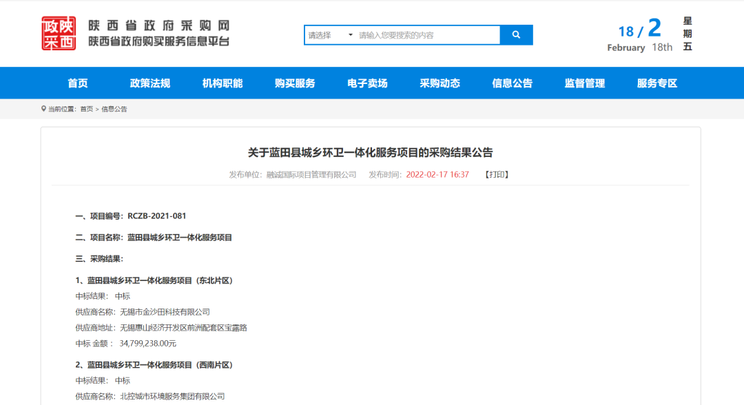 金沙田六天接連斬獲3個(gè)環(huán)衛(wèi)項(xiàng)目,總金額達(dá)4.41億元! 來源 | 環(huán)衛(wèi)科技網(wǎng)環(huán)衛(wèi)科技網(wǎng)訊,金沙田六天接連斬獲3個(gè)環(huán)衛(wèi)項(xiàng)目,總金額達(dá)4.41億元!藍(lán)田縣城鄉(xiāng)環(huán)衛(wèi)一體化服務(wù)項(xiàng)目2月17日,陜西省政府采購(gòu)網(wǎng)發(fā)布藍(lán)田縣城鄉(xiāng)環(huán)衛(wèi)一體化服務(wù)項(xiàng)目的采購(gòu)結(jié)果公告。金沙田中標(biāo)藍(lán)田縣城鄉(xiāng)環(huán)衛(wèi)一體化服務(wù)項(xiàng)目(東北片區(qū))標(biāo)段,中標(biāo)金額總計(jì)約3.48億元,特許經(jīng)營(yíng)期10年,其中包括1年建設(shè)期。該標(biāo)段范圍覆蓋藍(lán)關(guān)街道辦(北環(huán)路以北部分)、三里鎮(zhèn)區(qū)、華胥鎮(zhèn)區(qū)及洩湖鎮(zhèn)區(qū)(包含藍(lán)田縣工業(yè)園、西北家具工業(yè)園)。未來,金沙田科技將負(fù)責(zé)提供城區(qū)道路清掃保潔、垃圾收轉(zhuǎn)運(yùn)、公廁和文明驛站運(yùn)營(yíng)、綠化養(yǎng)護(hù)、垃圾分類、環(huán)衛(wèi)智慧平臺(tái)等環(huán)衛(wèi)服務(wù)。周至縣道路清掃保潔、垃圾清運(yùn)、綠化養(yǎng)護(hù)、公廁管理市場(chǎng)化運(yùn)作項(xiàng)目2月11日,陜西省政府采購(gòu)網(wǎng)發(fā)布周至縣道路清掃保潔、垃圾清運(yùn)、綠化養(yǎng)護(hù)、公廁管理市場(chǎng)化運(yùn)作項(xiàng)目采購(gòu)結(jié)果公告,第二標(biāo)段中標(biāo)方為金沙田,中標(biāo)金額為460.5萬元,服務(wù)期限1年。長(zhǎng)豐縣雙墩鎮(zhèn)城鄉(xiāng)環(huán)衛(wèi)一體化鎮(zhèn)區(qū)及合水路至下塘段采購(gòu)項(xiàng)目2月11日,中國(guó)政府采購(gòu)網(wǎng)發(fā)布長(zhǎng)豐縣雙墩鎮(zhèn)城鄉(xiāng)環(huán)衛(wèi)一體化鎮(zhèn)區(qū)及合水路至下塘段采購(gòu)項(xiàng)目中標(biāo)(成交)公告,中標(biāo)方為金沙田,中標(biāo)金額為8792.5萬元,服務(wù)期限1年,合同1年1簽,續(xù)簽不超過2年。1、雙墩鎮(zhèn)鎮(zhèn)區(qū)范圍內(nèi)的市政道路、重要道路及道路兩側(cè)的清掃保潔;2、雙墩鎮(zhèn)鎮(zhèn)區(qū)范圍內(nèi)街道、公園、游園、廣場(chǎng)等衛(wèi)生保潔;3、本次招標(biāo)范圍內(nèi)所有生活垃圾收集、轉(zhuǎn)運(yùn)至陶樓合肥長(zhǎng)豐皖能環(huán)保電力有限公司;4、雙墩鎮(zhèn)鎮(zhèn)區(qū)范圍內(nèi)繁華商業(yè)區(qū)、人群密集街道及主要交通道路路口文明勸導(dǎo)服務(wù);6、建立智慧環(huán)衛(wèi)信息管理系統(tǒng)平臺(tái)。接下來的3月份,金沙田又將會(huì)有哪些亮眼表現(xiàn)?來源 | 環(huán)衛(wèi)科技網(wǎng)
