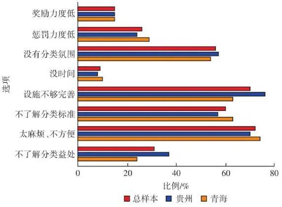 圖 4 實施垃圾分類的困難分析 完善配套設(shè)施是居民實施垃圾分類的硬件基礎(chǔ),但其所發(fā)揮的實際效果很大程度上取決于主觀因素,受政策宣傳的影響較大。調(diào)查對垃圾分類政策的了解情況,結(jié)果如圖4(b)所示,其選項包括“非常了解”“比較了解”“很少了解”和“完全不了解”,選擇率分別為6%、34%、55%、5%。60%的受訪者對相關(guān)政策的了解不充分,“非常了解”的受訪者不足一成,政策認知水平較低。與青海樣本相比,政策認知程度低的問題在貴州樣本中更突出[Sig.(雙側(cè))<0.05]。
