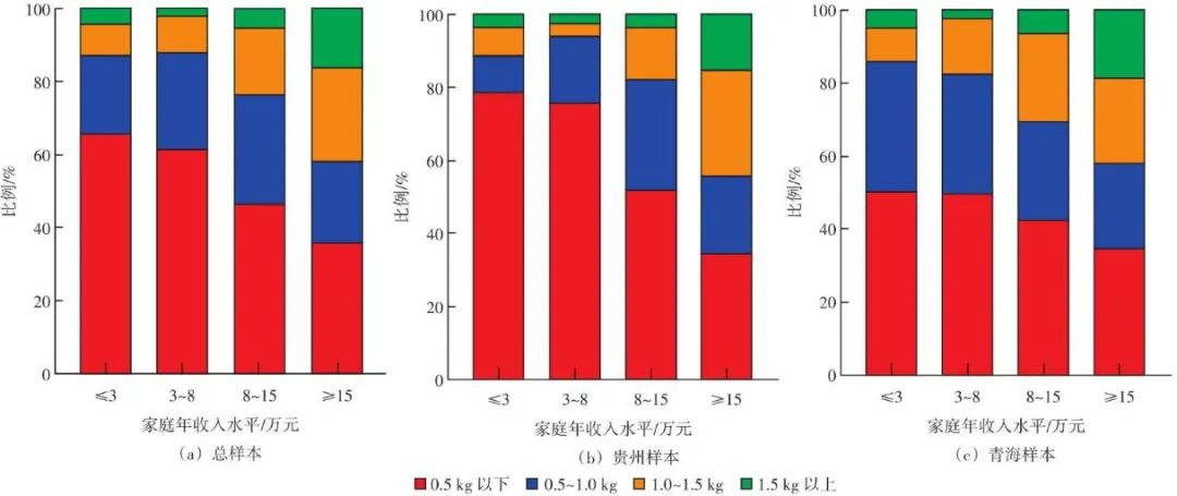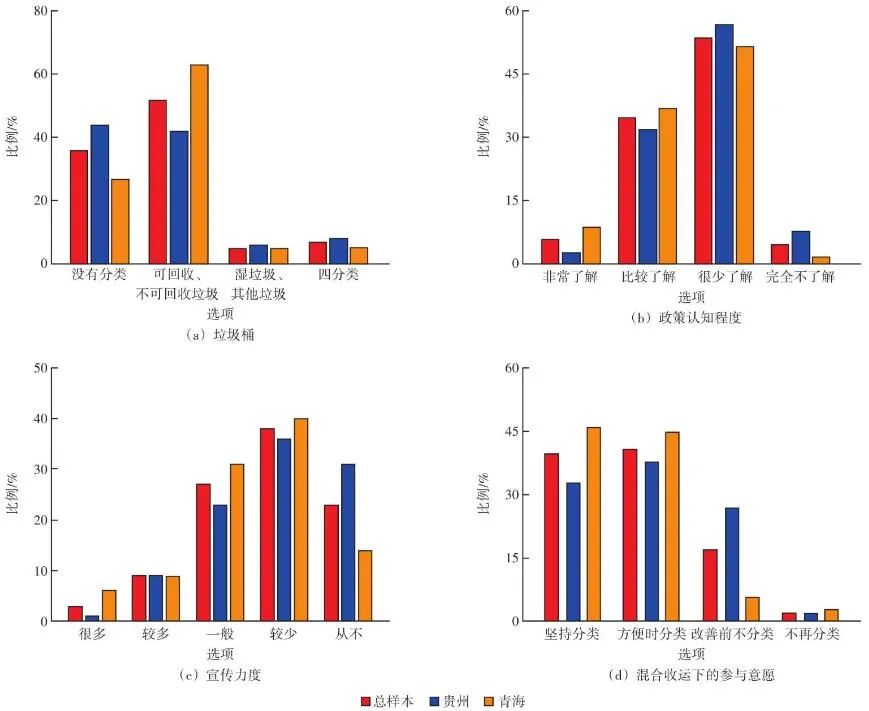 調(diào)查垃圾分類政策的宣傳力度,結(jié)果如圖4(c)所示,其設(shè)置“很多”“較多”“一般”“較少”“從不”5個選項,選擇率分別為4%、9%、27%、38%、22%。多數(shù)受訪者認為宣傳力度不足,認為宣傳“很多”的比例不足一成,“從不”宣傳的比例高達22%。與青海相比,貴州宣傳力度不足的問題更顯著[Sig.(雙側(cè))<0.05],極可能是貴州樣本政策認知程度較低的原因。