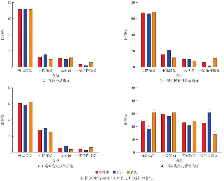 不同地區(qū)在垃圾分類管理模式的選擇上應(yīng)有所側(cè)重。以卡方檢驗分析兩地受訪者對管理模式的選擇差異,見圖5(d),兩地樣本在“分類獎勵”和“道德約束”兩項的選擇差異不顯著,而“強制懲罰”和“督導(dǎo)員指導(dǎo)”兩項的選擇存在顯著差異,因此強制型和引導(dǎo)型管理的側(cè)重更值得關(guān)注。青海居民更傾向于選擇“強制懲罰”(P<0.05),可能因為青海的環(huán)境衛(wèi)生壓力和居民參與意愿相對較高。同時選擇“懲罰力度較低”的比例相對較高(圖3),當?shù)貞土P力度不足問題可能更突出,建議青海相對側(cè)重加強強制型管理。貴州居民更傾向于選擇“督導(dǎo)員指導(dǎo)”(P<0.05),貴州居民參與意愿和政策認識水平相對較低,可能更需要督導(dǎo)員的專門指導(dǎo),建議貴州相對側(cè)重加強引導(dǎo)型管理。