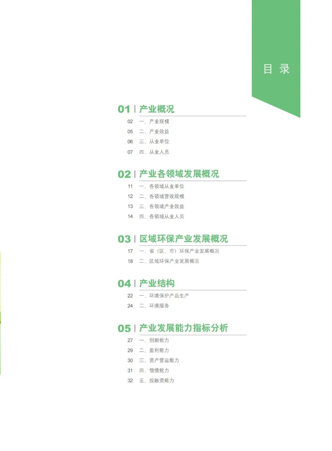 四、產(chǎn)業(yè)結(jié)構(gòu)2020年,列入全國(guó)環(huán)保產(chǎn)業(yè)重點(diǎn)企業(yè)基本情況調(diào) 查和全國(guó)環(huán)境服務(wù)業(yè)財(cái)務(wù)統(tǒng)計(jì)的15193家企業(yè)中,有 2088家企業(yè)從事環(huán)境保護(hù)產(chǎn)品生產(chǎn)活動(dòng),有13799家企 業(yè)從事環(huán)境服務(wù)活動(dòng)。其中,有1394家環(huán)境保護(hù)產(chǎn)品 生產(chǎn)專營(yíng)企業(yè),占比9.2%;13105家環(huán)境服務(wù)專營(yíng)企 業(yè),占比86.3%;694家環(huán)境保護(hù)產(chǎn)品生產(chǎn)及環(huán)境服務(wù) 兼營(yíng)企業(yè),占比4.5%。 1394家環(huán)境保護(hù)產(chǎn)品生產(chǎn)專營(yíng)企業(yè)實(shí)現(xiàn)營(yíng)業(yè)收入 701.7億元,環(huán)保業(yè)務(wù)營(yíng)業(yè)收入504.5億元,營(yíng)業(yè)利潤(rùn) 59.1億元,利潤(rùn)率8.4%,吸納就業(yè)人員75529人。與 2019年相比,2020年環(huán)境保護(hù)產(chǎn)品生產(chǎn)專營(yíng)相同樣本 企業(yè)的營(yíng)業(yè)收入增長(zhǎng)了1.5%,環(huán)保業(yè)務(wù)營(yíng)業(yè)收入增長(zhǎng) 了8.6%,營(yíng)業(yè)利潤(rùn)下降了2.7%,從業(yè)人員數(shù)量增加了 0.4%,利潤(rùn)率由8.7%降至8.3%。13105家環(huán)境服務(wù)專營(yíng)企業(yè)實(shí)現(xiàn)營(yíng)業(yè)收入6974.9億 元,環(huán)保業(yè)務(wù)營(yíng)業(yè)收入5203.8億元,營(yíng)業(yè)利潤(rùn)545.4億 元,利潤(rùn)率7.8%,吸納就業(yè)人員744420人。與2019年 相比,2020年環(huán)境服務(wù)專營(yíng)相同樣本企業(yè)的營(yíng)業(yè)收入 增長(zhǎng)了10.0%,環(huán)保業(yè)務(wù)營(yíng)業(yè)收入增長(zhǎng)了7.5%,營(yíng)業(yè) 利潤(rùn)增長(zhǎng)了1.7%,從業(yè)人員數(shù)量增加了5.2%,利潤(rùn)率 由8.5%降至7.9%。 694家環(huán)境保護(hù)產(chǎn)品生產(chǎn)及環(huán)境服務(wù)兼營(yíng)企業(yè)實(shí) 現(xiàn)營(yíng)業(yè)收入977.0億元,環(huán)保業(yè)務(wù)營(yíng)業(yè)收入525.2億元, 營(yíng)業(yè)利潤(rùn)71.3億元,利潤(rùn)率7.3%,吸納就業(yè)人員52782 人。與2019年相比,2020年環(huán)境保護(hù)產(chǎn)品生產(chǎn)及環(huán)境 服務(wù)兼營(yíng)相同樣本企業(yè)的營(yíng)業(yè)收入增長(zhǎng)48.9%,環(huán)保 業(yè)務(wù)營(yíng)業(yè)收入增長(zhǎng)了19.2%,營(yíng)業(yè)利潤(rùn)增長(zhǎng)了22.6%, 從業(yè)人員增加了8.1%,利潤(rùn)率由8.4%降至6.9%。五、產(chǎn)業(yè)發(fā)展能力指標(biāo)分析從創(chuàng)新能力看,與2019年相比,2020年相同樣 本企業(yè)研發(fā)經(jīng)費(fèi)支出占比同比保持穩(wěn)定,企業(yè)平均研 發(fā)經(jīng)費(fèi)同比增長(zhǎng),環(huán)境監(jiān)測(cè)領(lǐng)域增幅較大,企業(yè)平均 專利授權(quán)數(shù)量同比小幅增長(zhǎng),企業(yè)參與制修訂的標(biāo)準(zhǔn) 平均數(shù)量同比持平。相同樣本企業(yè)研發(fā)人員數(shù)同比微增,研發(fā)人員占從業(yè)人員比重小幅下降。但與作為戰(zhàn) 略性新興產(chǎn)業(yè)和享受高新技術(shù)企業(yè)待遇的行業(yè)應(yīng)擔(dān)負(fù) 的科技創(chuàng)新發(fā)展責(zé)任相比,環(huán)保企業(yè)還應(yīng)進(jìn)一步加大 研發(fā)投入力度。 從盈利能力看,2020年環(huán)保企業(yè)凈資產(chǎn)收益率相 對(duì)較低。與2019年相比,相同樣本企業(yè)凈資產(chǎn)收益率 同比下降,利潤(rùn)率同比基本保持穩(wěn)定。反映2020年我 國(guó)環(huán)保企業(yè)資產(chǎn)收益能力有所下降。從資產(chǎn)營(yíng)運(yùn)能力看,2020年環(huán)保企業(yè)總資產(chǎn)周轉(zhuǎn) 率較低,應(yīng)收賬款周轉(zhuǎn)率相對(duì)較差,與2019年相比, 2020年相同樣本企業(yè)總資產(chǎn)周轉(zhuǎn)率、應(yīng)收賬款周轉(zhuǎn)率 均保持穩(wěn)定。反映環(huán)保企業(yè)的資產(chǎn)營(yíng)運(yùn)能力保持穩(wěn)定,但回款問(wèn)題仍較突出。 從償債能力看,2020年環(huán)保企業(yè)資產(chǎn)負(fù)債水平總 體處于中等水平。與2019年相比,2020年相同樣本企 業(yè)資產(chǎn)負(fù)債率平均值同比下降1個(gè)百分點(diǎn),為58.7%, 總體處于合理區(qū)間。 從投融資能力看,2020年,水污染防治、固廢處理處置與資源化領(lǐng)域依然為年度環(huán)保產(chǎn)業(yè)投資熱點(diǎn)領(lǐng) 域。與2019年相比,2020年相同樣本企業(yè)投資額同比增長(zhǎng)明顯。固體廢物處理處置與資源化、土壤修復(fù)領(lǐng)域企業(yè)投資額同比增幅較大。環(huán)保產(chǎn)業(yè)融資依然以銀 行及信用社貸款為代表的間接融資方式為主,企業(yè)融 資額同比大幅增長(zhǎng)。 總體來(lái)看,2020年,我國(guó)環(huán)保產(chǎn)業(yè)創(chuàng)新能力有所增強(qiáng),盈利水平略有下滑,資產(chǎn)營(yíng)運(yùn)能力保持穩(wěn)定, 資產(chǎn)負(fù)債水平處于合理區(qū)間,但回款問(wèn)題仍較突出, 成本壓力呈加大趨勢(shì)。 點(diǎn)擊文末“閱讀原文”查看完整版報(bào)告
