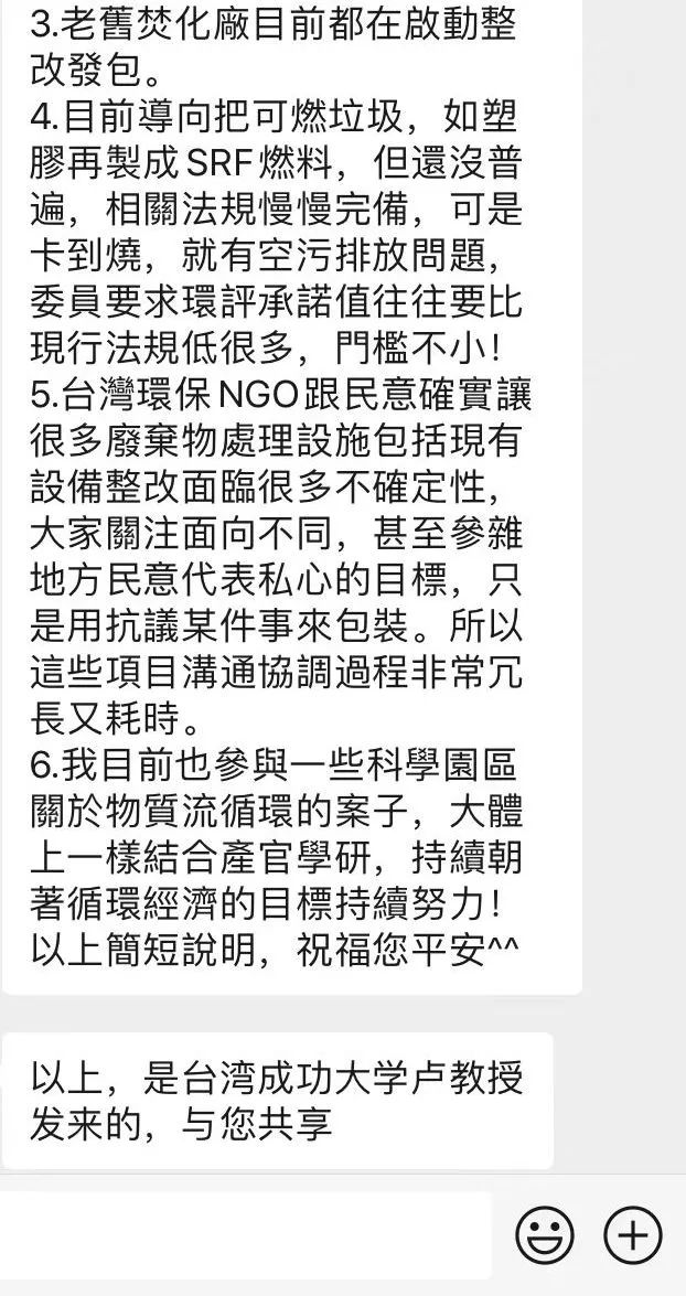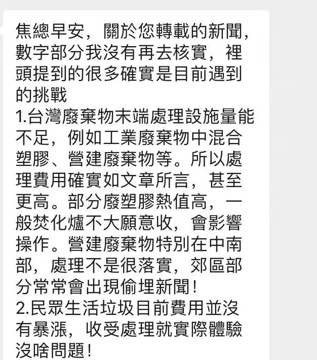 清氣團在發(fā)布了相關(guān)臺灣垃圾分類處置研究的文章后,也獲得臺灣當(dāng)?shù)毓虖U同行的注意,并通過國內(nèi)某熱心同行老總,輾轉(zhuǎn)傳來相關(guān)回應(yīng)。