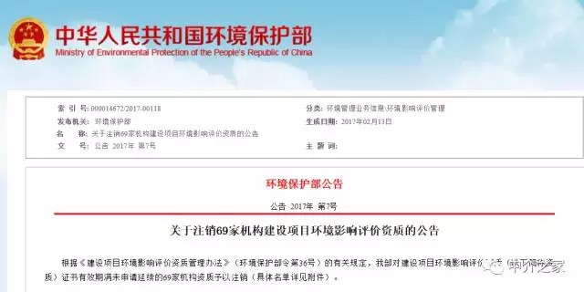 關(guān)于注銷69家機(jī)構(gòu)建設(shè)項(xiàng)目環(huán)境影響評(píng)價(jià)資質(zhì)的公告