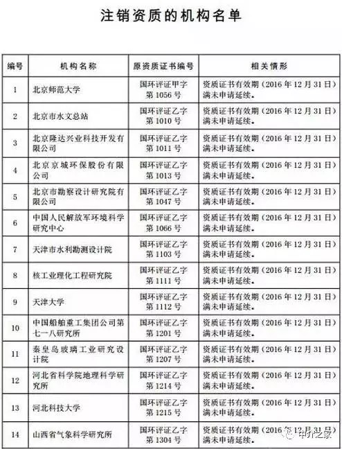 據(jù)固廢觀察不完全統(tǒng)計(jì),近一年多來環(huán)保部發(fā)布的相關(guān)公告包括:2015年10月13日注銷北京大學(xué)等9家,2015年12月29日注銷寧波大學(xué)等6家,2016年2月2 日注銷江西省農(nóng)業(yè)科學(xué)院等42家,2016年3月2日注銷青島大學(xué)等31家,2016年7月11日注銷天津市環(huán)境影響評(píng)價(jià)中心等29家,2016年12月24日注銷昆明市環(huán)境科學(xué)研究院等13家,2017年2月10日注銷北京師范大學(xué)等69家。