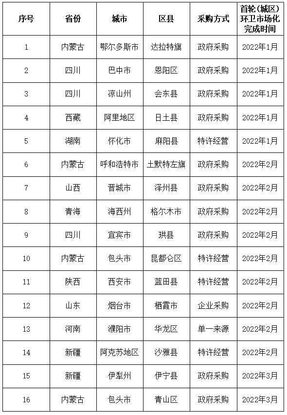 截止2021年12月31日,全國完成城區(qū)(首輪)環(huán)衛(wèi)市場化改革的區(qū)縣數(shù)量為2006個,城區(qū)環(huán)衛(wèi)市場化率為70.34%。進(jìn)一步的數(shù)據(jù)分析顯示,在2022年度完成首輪環(huán)衛(wèi)市場化改革的16個區(qū)縣,采取“非政府采購”方式的區(qū)縣占比達(dá)到37%,接近四成。在采取“非政府采購”方式的6個區(qū)縣中,其中:采取“特許經(jīng)營”方式的區(qū)縣有4個,采取“企業(yè)采購”和“單一來源采購”方式的區(qū)縣各1個。附1:2022年度完成城區(qū)環(huán)衛(wèi)市場化(16個)區(qū)縣分布附2:2022年度完成城區(qū)環(huán)衛(wèi)市場化區(qū)縣具體明細(xì)