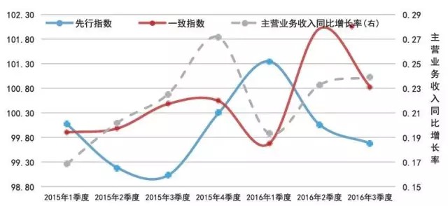2015 年1季度-2016年3季度A股環(huán)保上市企業(yè)數(shù)據(jù)測算結(jié)果顯示:一致指數(shù)與A股環(huán)保上市企業(yè)主營業(yè)務(wù)收入增長率的變化趨勢基本吻合(如圖3所示),先行指 數(shù)的先行特征顯著,驗(yàn)證了EICI指標(biāo)體系的有效性。此外,對先行指數(shù)進(jìn)行的周期性檢驗(yàn)結(jié)果表明,主營環(huán)保上市企業(yè)的先行指數(shù)的領(lǐng)先周期在2015年度為 2個季度、在2016年度為1個季度(如圖4所示),該結(jié)果表現(xiàn)出環(huán)保產(chǎn)業(yè)的經(jīng)濟(jì)敏感度有所提高,即先行指數(shù)結(jié)果可用于對環(huán)保產(chǎn)業(yè)未來1個季度的走勢進(jìn)行 預(yù)判。