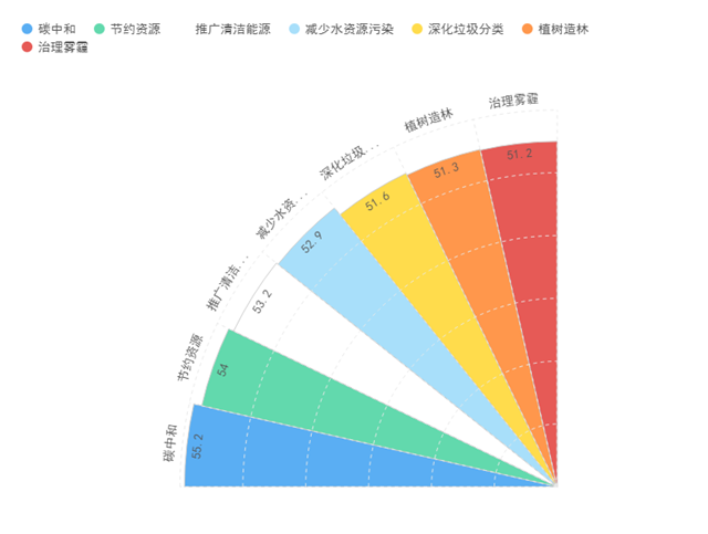 正如中國青年報也在兩會前夕做的調查結果一樣:綠色出行(60.1%)、碳中和(55.2%)、節(jié)約資源(54.0%)、推廣清潔能源(53.2%)、減少水資源污染(52.9%)、深化垃圾分類(51.6%)、植樹造林(51.3%)、治理霧霾(51.2%)。