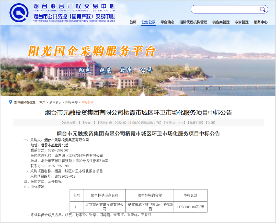 煙臺市公共資源(國有產(chǎn)權(quán))交易中心消息,2022年2月11日,煙臺市元融投資集團(tuán)有限公司棲霞市城區(qū)環(huán)衛(wèi)市場化服務(wù)項目開標(biāo),中標(biāo)結(jié)果如下: