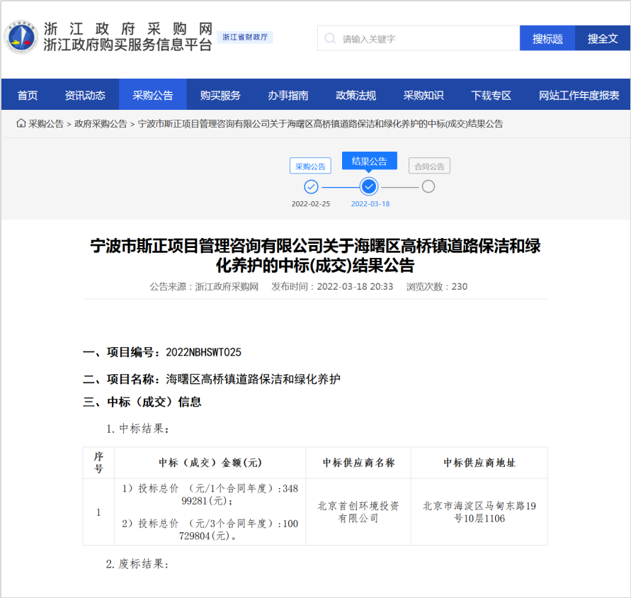3月18日,浙江政府采購網(wǎng)發(fā)布寧波市海曙區(qū)高橋鎮(zhèn)道路保潔和綠化養(yǎng)護(hù)項目中標(biāo)公告,北京首創(chuàng)環(huán)境投資有限公司以10072.9804萬元/3年的投標(biāo)價格中標(biāo)該項目。 近日,首創(chuàng)環(huán)境在環(huán)衛(wèi)市場連下兩城,中標(biāo)金額約1.6億元。