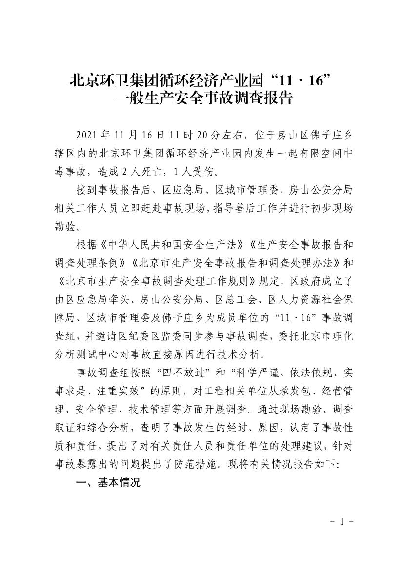 日前,北京市應(yīng)急管理局公布北京環(huán)衛(wèi)集團(tuán)循環(huán)經(jīng)濟(jì)產(chǎn)業(yè)園“11·16”一般生產(chǎn)安全事故調(diào)查報(bào)告。報(bào)告顯示,2021年11月16日,位于房山區(qū)佛子莊鄉(xiāng)的北京環(huán)衛(wèi)集團(tuán)循環(huán)經(jīng)濟(jì)產(chǎn)業(yè)園內(nèi)發(fā)生一起有限空間中毒事故,造成2人死亡,1人受傷。
