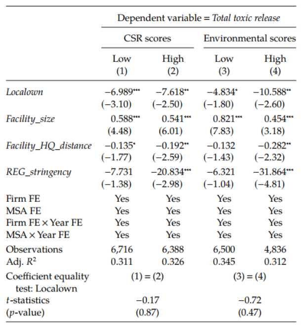 本文結(jié)論有如下幾方面:一是地方機(jī)構(gòu)所有權(quán)與設(shè)施有毒物質(zhì)排放量始終呈現(xiàn)出負(fù)相關(guān)關(guān)系。二是這種負(fù)相關(guān)關(guān)系在地方SRI基金、地方公共養(yǎng)老基金和地方專業(yè)投資機(jī)構(gòu)中體現(xiàn)的更為明顯。三是在環(huán)境偏好更嚴(yán)格以及集體凝聚力更強(qiáng)的社區(qū),地方機(jī)構(gòu)所有權(quán)與設(shè)施污染排放量的負(fù)相關(guān)關(guān)系更為明顯。最后,文中同樣發(fā)現(xiàn)發(fā)現(xiàn)本地機(jī)構(gòu)所有權(quán)與ESG提案被引入的概率之間存在正相關(guān)關(guān)系。本文的結(jié)果為機(jī)構(gòu)投資者在影響企業(yè)ESG表現(xiàn)方面的作用機(jī)制和有效性提供了經(jīng)驗(yàn)證據(jù)。