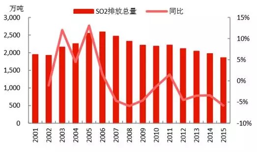 SO2的排放量為1859萬噸,每年基本以4%左右的速度下降,而收關(guān)年2015年下降速度高達(dá)5.84%;