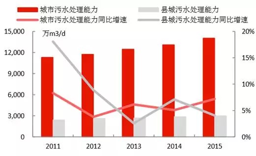 4)城市污水處理能力在2015年達(dá)到1.40億立方米/日,同比增長7.19%;縣城達(dá)到2999萬立方米/日,同比增長了4.06%,城市和縣城的污水處理率分別達(dá)到91.9%和85.2%,較2010年分別提升了9.6和25.1個(gè)百分點(diǎn)。