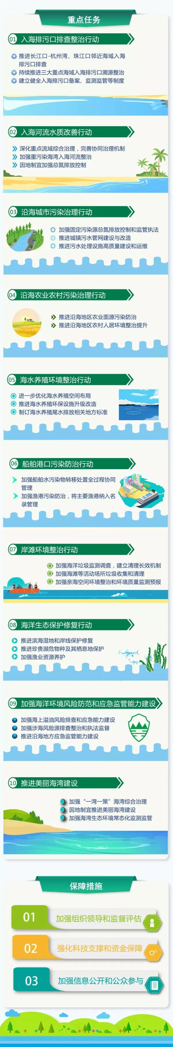 《重點海域綜合治理攻堅戰(zhàn)行動方案》提出開展:入海排污口排查整治行動、入海河流水質(zhì)改善行動、沿海城市污染治理行動、沿海農(nóng)業(yè)農(nóng)村污染治理行動、海水養(yǎng)殖環(huán)境整治行動、船舶港口污染防治行動、岸灘環(huán)境整治行動、海洋生態(tài)保護(hù)修復(fù)行動等“七大行動”。
