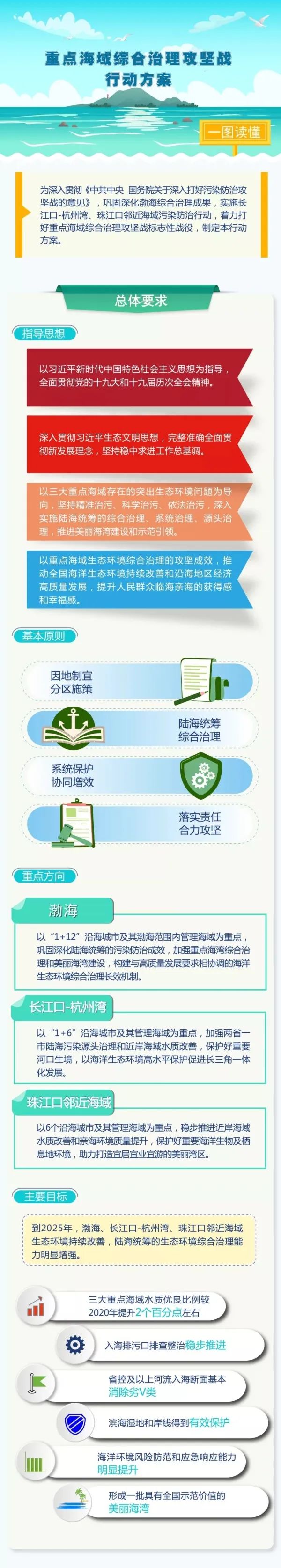 近日,生態(tài)環(huán)境部、發(fā)展改革委、自然資源部、住房和城鄉(xiāng)建設(shè)部、交通運(yùn)輸部、農(nóng)業(yè)農(nóng)村部和中國海警局聯(lián)合印發(fā)《重點海域綜合治理攻堅戰(zhàn)行動方案》(以下簡稱《行動方案》),對“十四五”時期渤海、長江口-杭州灣和珠江口鄰近海域等三大重點海域綜合治理攻堅行動的總體要求、主要目標(biāo)、重點任務(wù)和保障措施等作出了部署安排。