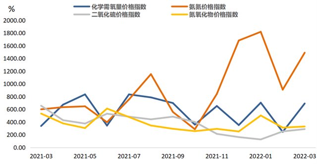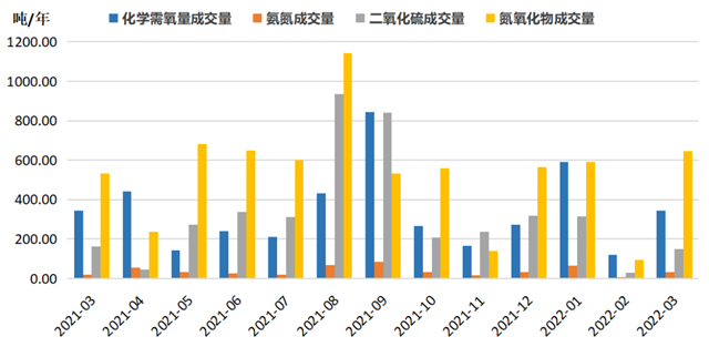 排污權(quán)成交量指標(biāo)止跌回升,四項(xiàng)污染物指標(biāo)同步上行。2022年3月,四項(xiàng)排污權(quán)成交量合計(jì)為1174.10噸,環(huán)比增長(zhǎng)379.27%,與上年同期相比增長(zhǎng)10.99%。