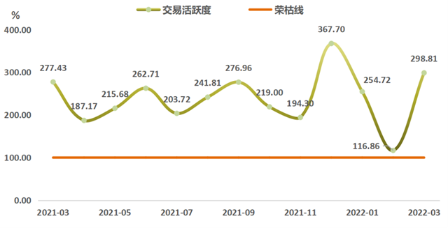 2022年3月,浙江省排污權(quán)交易活躍度指數(shù)值為298.81點(diǎn),環(huán)比上行155.69%,與上年同期相比上行7.71%。