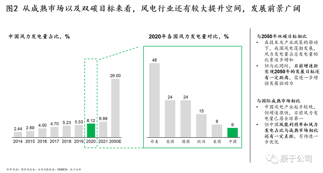 相比之下,當(dāng)前風(fēng)電的體量還相對(duì)較小——2021年中國(guó)風(fēng)力發(fā)電量占比僅為6.99%,雙碳政策要求風(fēng)力發(fā)電量占比在2030年達(dá)到26%的目標(biāo)。國(guó)際上不少國(guó)家的風(fēng)力發(fā)電占比已經(jīng)很高,例如丹麥風(fēng)力發(fā)電量占比達(dá)到了48%,英國(guó)、德國(guó)也都超過(guò)了20%(見(jiàn)圖2)。