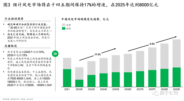 在政策和技術(shù)兩大因素的驅(qū)動(dòng)下,辰于預(yù)測(cè)我國(guó)風(fēng)電市場(chǎng)整體將在十四五期間保持17%的增速,在2025年達(dá)到8000億元,在2030年突破12000億元(包括投資和運(yùn)營(yíng),見(jiàn)圖3),市場(chǎng)規(guī)模達(dá)到萬(wàn)億只是未來(lái)10年間的事情。