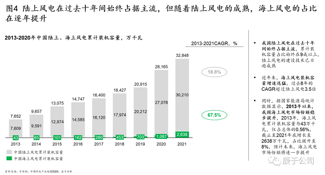 從裝機(jī)容量來(lái)看,我國(guó)陸上風(fēng)電在過(guò)去十年始終占據(jù)主流,累計(jì)裝機(jī)容量占比一直保持在9成以上,截至2021年,中國(guó)陸上風(fēng)電累計(jì)裝機(jī)容量為3.02億千瓦,海上風(fēng)電為0.26億千瓦,陸上風(fēng)電累計(jì)裝機(jī)容量超過(guò)海上風(fēng)電的十倍(見(jiàn)圖4)。
