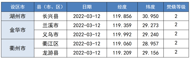 浙江省生態(tài)環(huán)境監(jiān)測(cè)中心基于TERRA/MODIS(上午)和AQUA/MODIS(下午)衛(wèi)星遙感數(shù)據(jù),2022年3月,共監(jiān)測(cè)到秸稈焚燒火點(diǎn)5個(gè)(不包括云覆蓋下的火點(diǎn)信息),同比減少1個(gè),所屬轄區(qū)為湖州市、金華市和衢州市,其余設(shè)區(qū)市未監(jiān)測(cè)到火點(diǎn)。