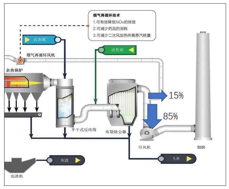 目前能夠滿足《生活垃圾污染控制標(biāo)準(zhǔn)》(GB18485-2014)和歐盟EU2010/75/EC排放標(biāo)準(zhǔn)的煙氣凈化處理工藝以“SNCR+半干法+干法+活性炭+袋式除塵”和“SNCR+半干法+干法+活性炭+袋式除塵+濕法”為主。但部分省市對(duì)NOx的排放標(biāo)準(zhǔn)提出了更高的要求,如DB37/2376-2013山東省區(qū)域性大氣污染物綜合排放標(biāo)準(zhǔn)的重點(diǎn)控制區(qū)域NOx限值為100mg/m3,垃圾焚燒煙氣NOx排放濃度限值低于100mg/m3成了一個(gè)趨勢(shì)。部分焚燒項(xiàng)目因此增加了SCR工藝以適應(yīng)更高的環(huán)保要求。主流的脫硝技術(shù)包括焚燒爐燃燒控制爐溫、煙氣再循環(huán)技術(shù)、SNCR系統(tǒng)、SCR系統(tǒng)以及ICR(PNCR)系統(tǒng),其中焚燒爐燃燒控制爐溫與煙氣回流技術(shù)可有效降低原始NOx濃度。但通常采用焚燒爐燃燒控制爐溫、煙氣回流以及SNCR脫硝系統(tǒng)的情況下,NOx排放值仍無法穩(wěn)定控制在100mg/m3以內(nèi)。針對(duì)NOx排放限值為100mg/m3的垃圾焚燒項(xiàng)目,目前國(guó)內(nèi)垃圾焚燒發(fā)電廠采用的脫硝工藝有SNCR+SCR系統(tǒng)以及SNCR+ICR(PNCR)系統(tǒng)。從上海環(huán)境洛陽項(xiàng)目應(yīng)用組合“煙氣再循環(huán)+SNCR+ICR(PNCR)”脫硝工藝后運(yùn)行工況穩(wěn)定性較好,綜合成本更低。對(duì)于原先未采用煙氣再循環(huán)工藝的焚燒廠,如在引風(fēng)機(jī)前增加煙氣再循環(huán)工藝,可有效降低引風(fēng)機(jī)的電功率,利用再循環(huán)風(fēng)替代原有二次風(fēng),可實(shí)現(xiàn)引風(fēng)機(jī)的運(yùn)行功率降低約10%。而且,應(yīng)用煙氣再循環(huán)工藝后,爐內(nèi)過量空氣系數(shù)降低,焚燒爐出口NOx原始濃度可降低約30%-40%,穩(wěn)定控制在200mg/Nm3以內(nèi),入爐噸垃圾尿素消耗量可節(jié)約0.5kg左右,降低系統(tǒng)運(yùn)行的能耗和藥劑消耗,實(shí)現(xiàn)碳減排。