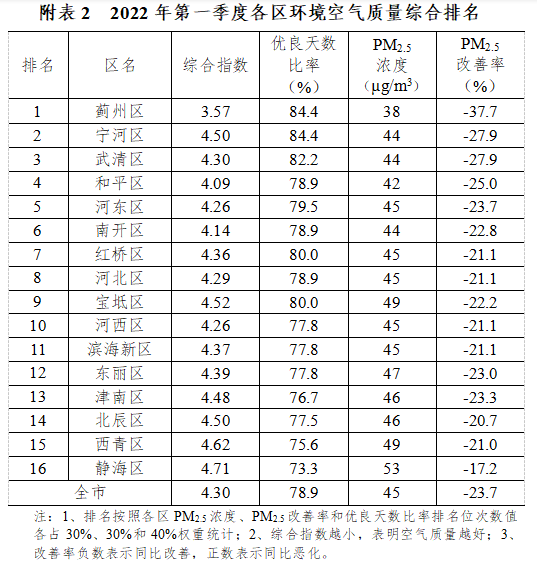 2022年第一季度,各區(qū)PM2.5濃度在38——53µg/m3之間,優(yōu)良天數(shù)比率在73.0%——84.4%之間。按照PM2.5濃度、PM2.5改善率和優(yōu)良天數(shù)比率排名位次數(shù)值各占30%、30%和40%的權(quán)重進行排名,第一季度排名較好的區(qū)為薊州區(qū)、寧河區(qū)和武清區(qū),較差區(qū)為靜海區(qū)、西青區(qū)和北辰區(qū)。