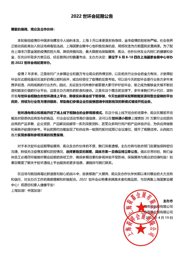 本輪新冠疫情在中國多地爆發(fā)令人始料未及,上海3月以來更是形勢急轉,全市疫情防控形勢嚴峻。社會各界正被動員起來加入到這場病毒狙擊戰(zhàn),上海國家會展中心也積極投身抗疫,局部改造為方艙醫(yī)院安置病患。為了配合上海市乃至全國的疫情防控大局,降低傳播風險,最大限度地保障展商、觀眾、合作伙伴及業(yè)內同仁的健康和安全,在充分聽取多方意見后,經反復商討和慎重考慮,主辦方決定:原定于6月8-10日在上海國家會展中心舉辦的2022世環(huán)會將延期舉辦。