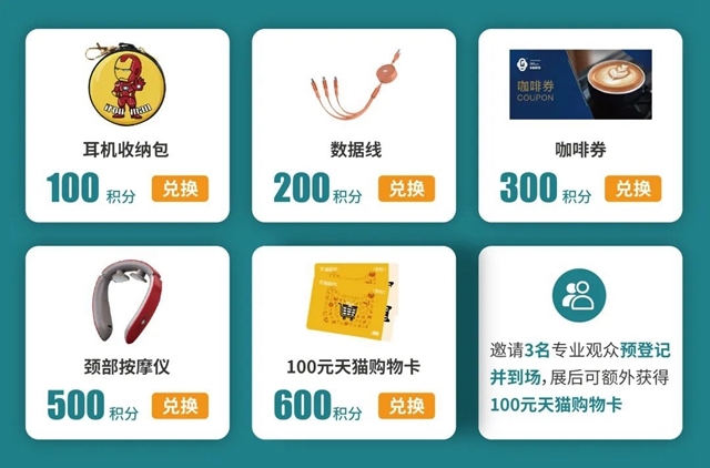 注:積分可在展會現場兌換天貓購物卡、頸部按摩儀、咖啡券、收納包等精美禮品