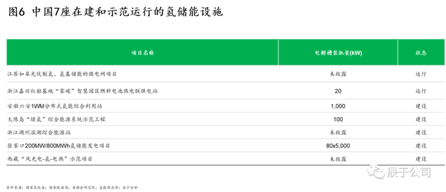 氫儲能優(yōu)勢突出,是“可再生能源+儲能”的重要發(fā)展方向。由于沒有剛性的儲存容量限制,可跨季節(jié)儲能,氫儲能是集中式可再生能源大規(guī)模長周期儲存的最佳途徑;在規(guī)模儲能方面,氫儲能相比電池儲能的成本也至少低了一個(gè)數(shù)量級;加之氫儲能的制運(yùn)儲方式靈活,適用于長管拖車、管道輸氫、摻氫、長途輸電+當(dāng)?shù)刂茪涞榷喾N方式,并可根據(jù)不同領(lǐng)域的需求轉(zhuǎn)換為電能、熱能、化學(xué)能等多種能量形式,應(yīng)用范圍廣泛。近年來,與氫儲能相關(guān)的政策不斷出臺,例如2022年2月,發(fā)改委、國家能源局印發(fā)了《“十四五”新型儲能發(fā)展實(shí)施方案》,將氫儲能列入“十四五”新型儲能核心技術(shù)裝備攻關(guān)重點(diǎn)方向及新型儲能技術(shù)試點(diǎn)示范,提出到2025年,氫儲能等長時(shí)間尺度儲能技術(shù)取得突破。整體而言,氫儲能行業(yè)前景廣闊,但目前還處于技術(shù)研發(fā)、工程示范階段,我國現(xiàn)有7座在建和示范運(yùn)行的氫儲能設(shè)施,分布在浙江、江蘇、安徽、河北、西藏等地(見圖6)。