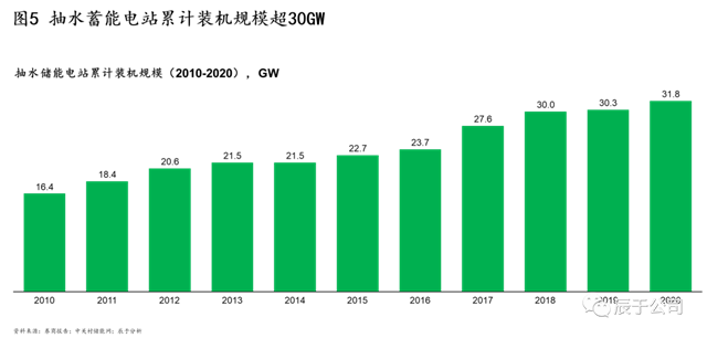 過去儲能行業(yè)的發(fā)展主要集中在電網(wǎng)側(cè),電網(wǎng)通過配備大型抽水蓄能保障電力系統(tǒng)安全穩(wěn)定經(jīng)濟(jì)運(yùn)行。而抽水蓄能的投資主體也相對單一,在已建成的抽水蓄能電站中70%是由電網(wǎng)企業(yè)投資運(yùn)營,配置在輸配電側(cè),營利與整個(gè)電網(wǎng)運(yùn)營進(jìn)行捆綁計(jì)算,整體開發(fā)市場化程度低。在此背景下,我國抽水蓄能隨著電力系統(tǒng)的需要而穩(wěn)步緩慢發(fā)展,到2020年裝機(jī)累計(jì)裝機(jī)規(guī)模達(dá)到31.8GW,占全部儲能的90%以上(見圖5)。