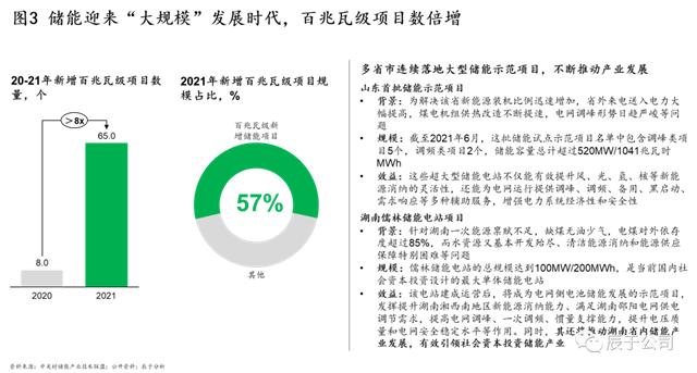與此同時(shí),大規(guī)模的儲能項(xiàng)目也在快速部署,儲能迎來“大規(guī)模”發(fā)展時(shí)代。2021年新增規(guī)劃、在建、投運(yùn)百兆瓦級項(xiàng)目的數(shù)量刷新歷年紀(jì)錄,達(dá)到65個(gè),超過2020年同期的8倍;百兆瓦級項(xiàng)目規(guī)模達(dá)14.2GW,占2021年新增儲能項(xiàng)目總規(guī)模的57%。同時(shí)多省市也連續(xù)落地大型儲能示范項(xiàng)目,不斷推動(dòng)產(chǎn)業(yè)發(fā)展,僅去年12月,山東首批儲能示范項(xiàng)目、湖南儒林儲能電站項(xiàng)目、張家口儲能壓縮空氣儲能電站項(xiàng)目等十余個(gè)百兆瓦級項(xiàng)目相繼并網(wǎng),推動(dòng)儲能產(chǎn)業(yè)發(fā)展的同時(shí),有效引領(lǐng)社會資本投資(見圖3)。