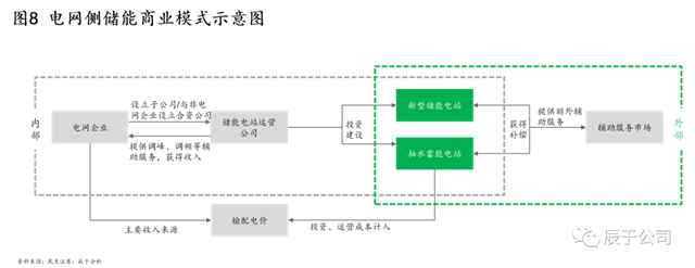 由于電力系統(tǒng)需要調(diào)頻、調(diào)峰等輔助服務(wù),保障發(fā)電和負(fù)載消耗的有功功率相平衡,以維護(hù)電力系統(tǒng)的安全穩(wěn)定運(yùn)行,保證電能質(zhì)量,電網(wǎng)公司會通過投資抽水蓄能和新型儲能電站等,由下屬子公司獨(dú)立或與傳統(tǒng)火電廠聯(lián)合運(yùn)營,電網(wǎng)根據(jù)內(nèi)部需求向儲能電站調(diào)度輔助服務(wù),并向其支付租金;這些儲能電站如有余量還可參與外部輔助服務(wù)市場交易以獲得補(bǔ)償。按國家規(guī)定為特定發(fā)電側(cè)主體服務(wù)提供的輔助服務(wù)品種,補(bǔ)償費(fèi)用由這些主體承擔(dān);為特定電力用戶提供的服務(wù)同理。此外,電網(wǎng)側(cè)儲能還可以通過峰谷價(jià)差獲取少部分收入(見圖8)。整體來看,電網(wǎng)側(cè)經(jīng)濟(jì)性凸顯,在部分地區(qū)市場化交易程度高,未來市場化交易模式有望在全國普及。