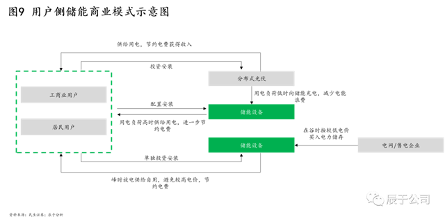 用戶側(cè)儲能主要布局在工商業(yè)企業(yè)園區(qū)和家庭住宅,商業(yè)模式也已跑通,主要分為兩種,一是構(gòu)建光儲一體系統(tǒng),根據(jù)供需調(diào)整分布式光伏等不穩(wěn)定發(fā)電,提高其發(fā)電能的利用率,實(shí)現(xiàn)能源自給;二是削峰填谷,實(shí)現(xiàn)峰谷電價(jià)套利。此外也可用作應(yīng)急備用電源。這些用途可并行也可獨(dú)立存在,本質(zhì)上都是通過節(jié)省用戶的用電成本,保障電力穩(wěn)定供應(yīng),間接創(chuàng)造收入(見圖9)。具體來看: