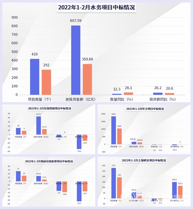 從上述圖表來看,2022年前兩個月,環(huán)衛(wèi)中標項目最多,水務中標金額最大,餐廚垃圾的同比下滑最多,土壤修復2個月的投資額同比增幅均超過了110%,1月更是達到了150.6%,而同時中標數量卻是下降的,堪稱“完美逆襲”。