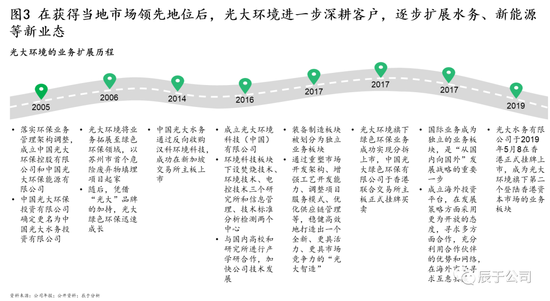 光大環(huán)境在獲得當?shù)乩贌袌龅念I(lǐng)先地位后,進一步深耕客戶,逐步擴展水務、新能源等業(yè)態(tài)(見圖3),最終目標是打造成為一站式環(huán)境綜合治理服務商,形成環(huán)保能源、綠色環(huán)保、環(huán)保水務、生態(tài)資源、環(huán)境規(guī)劃、綠色科創(chuàng)、光大照明、裝備制造八大業(yè)務板塊,深挖協(xié)同效應。