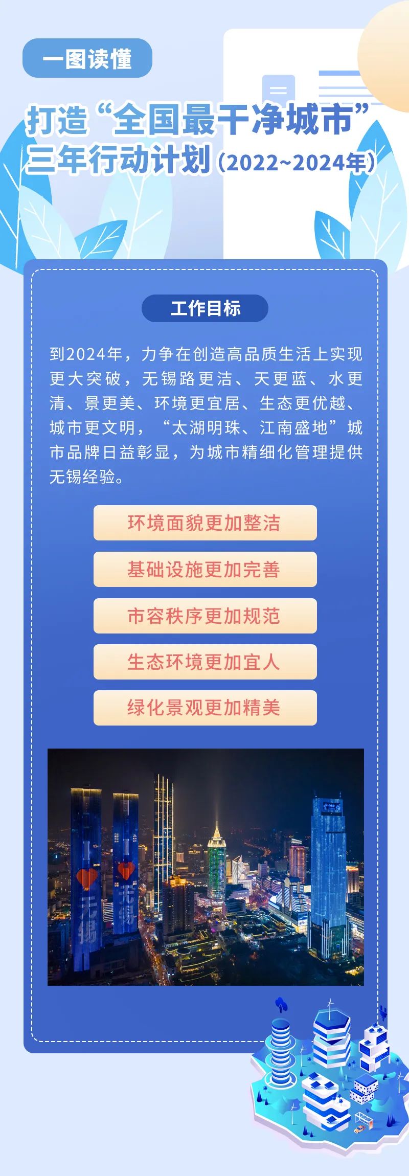 無錫市近日下發(fā)《打造“全國最干凈城市”三年行動(dòng)計(jì)劃(2022-2024年)》。去年底,無錫市政府印發(fā)《關(guān)于推進(jìn)無錫市區(qū)環(huán)衛(wèi)一體化作業(yè)改革的實(shí)施意見》。 在城市里旅游,除了特色景點(diǎn)、公共設(shè)施外,城市的干凈程度對(duì)游客而言是非常重要的印象分。而對(duì)于居住在這座城市的市民來說,清新的空氣、整潔的街道、蔥郁的綠化、清澈的水體,就算每天只在街巷里活動(dòng),也能覺得心曠神怡。當(dāng)前,城市發(fā)展中宜居、綠色、韌性、智慧、人文等需求更加凸顯,城市綜合實(shí)力和核心競(jìng)爭(zhēng)力的比拼,越來越外在體現(xiàn)為城市環(huán)境的比拼、城市品質(zhì)的比拼?!拔嗤P凰棲,花香蝶自來”。打造“全國最干凈城市”就是在提升營商環(huán)境,就是在優(yōu)化創(chuàng)新創(chuàng)業(yè)環(huán)境。為此,無錫市發(fā)布了打造“全國最干凈城市”三年行動(dòng)計(jì)劃:到2024年,力爭(zhēng)在創(chuàng)造高品質(zhì)生活上實(shí)現(xiàn)更大突破,無錫路更潔、天更藍(lán)、水更清、景更美、環(huán)境更宜居、生態(tài)更優(yōu)越、城市更文明,“太湖明珠、江南盛地”城市品牌日益彰顯,為城市精細(xì)化管理提供無錫經(jīng)驗(yàn)。 說到干凈城市,過去大家的印象無非是主次干道、街巷路面清潔,沒有違法建筑和違法戶外廣告,垃圾、污水無害化處理率高,城市綠化面積多等。總而言之,只要城市的清掃保潔落實(shí)到位就行。如今,僅僅是環(huán)衛(wèi)意義上的干凈已不能滿足全市人民對(duì)美好生活的向往。