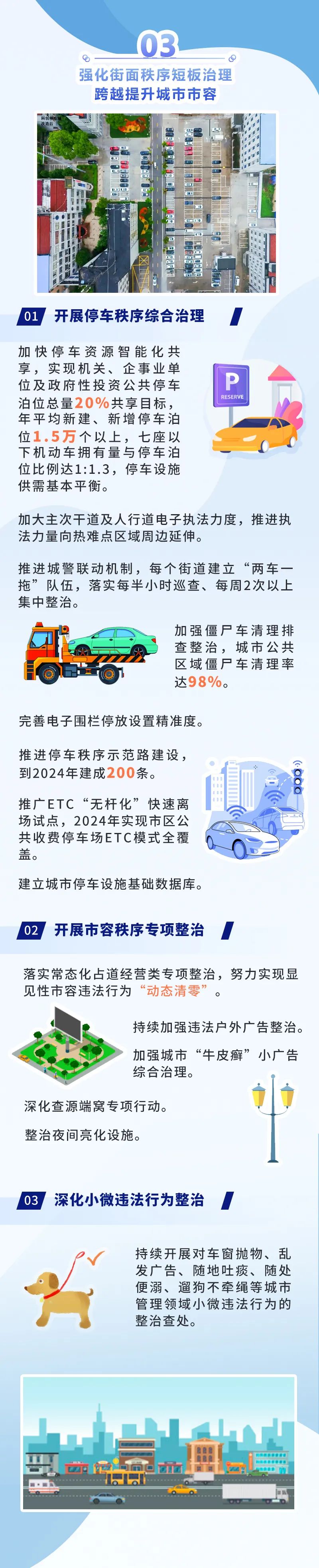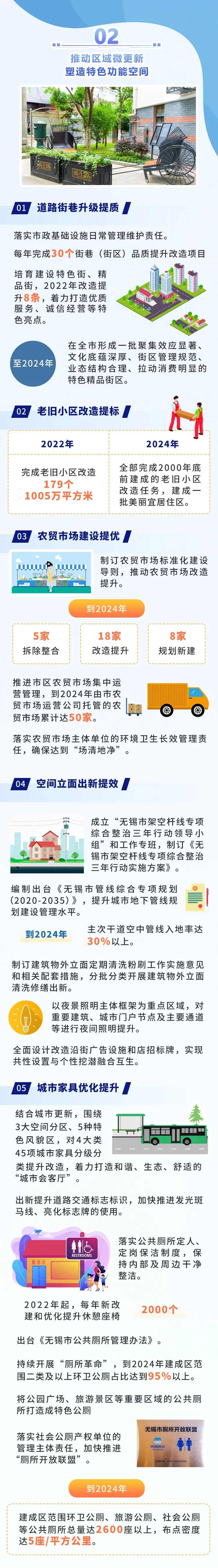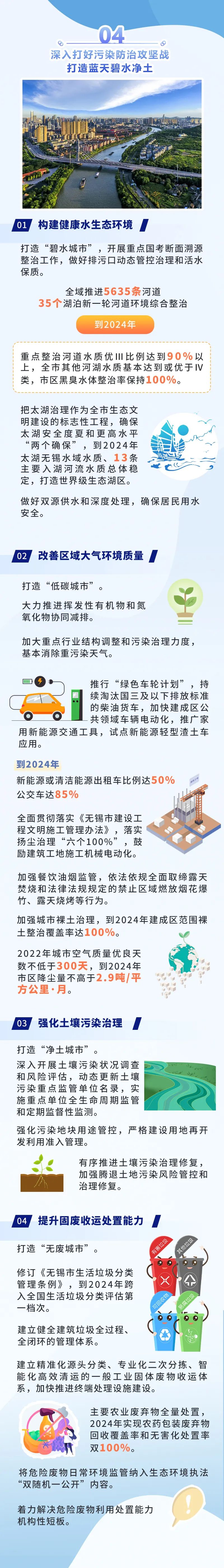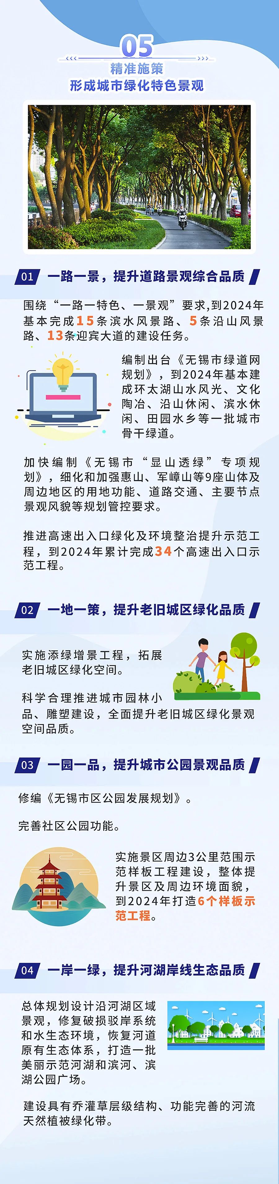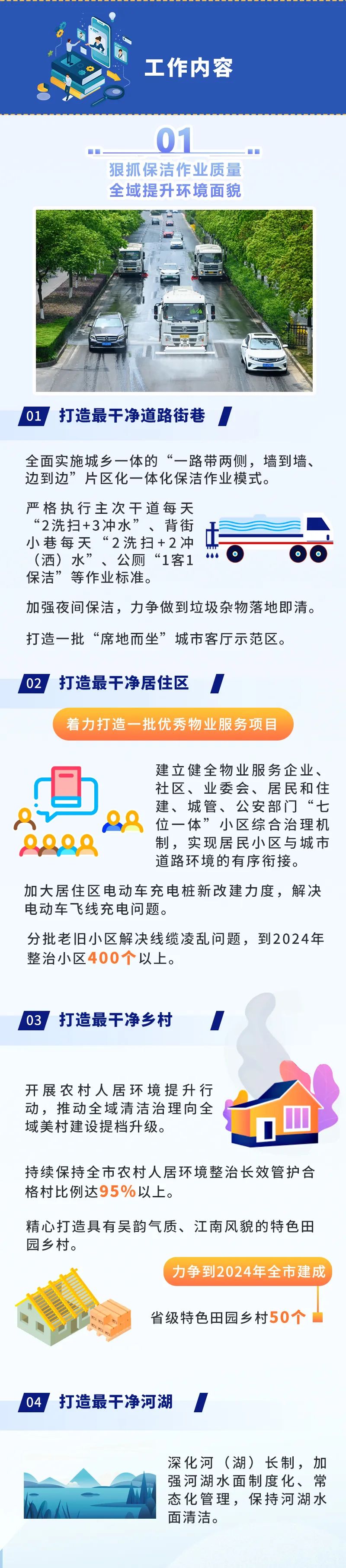 ●環(huán)境面貌更加整潔。到2024年,全市主次干道潔凈度100%、背街小巷潔凈度90%、河湖水面潔凈度100%、綠化區(qū)域潔凈度100%、小區(qū)環(huán)境潔凈度90%,打造“席地而坐”城市客廳示范區(qū)100個(gè)。●基礎(chǔ)設(shè)施更加完善。2000年底前建成的老舊小區(qū)改造率100%,完成街巷(街區(qū))品質(zhì)提升改造項(xiàng)目100個(gè),建成區(qū)一類環(huán)衛(wèi)公廁比例25%;基礎(chǔ)設(shè)施管養(yǎng)到位,主要道路黑色化、標(biāo)線本色化95%,人行道板完好率95%,路燈設(shè)施亮燈率99%,戶外廣告設(shè)施整潔完好率95%,城市家具清潔完好率98%。●市容秩序更加規(guī)范。市區(qū)道路停車泊位管理覆蓋率100%,三亂小廣告治理覆蓋率100%,市容環(huán)衛(wèi)責(zé)任區(qū)履約率100%,顯見性市容違法行為“動(dòng)態(tài)清零”。●生態(tài)環(huán)境更加宜人。重污染天氣基本消除,空氣質(zhì)量?jī)?yōu)良天數(shù)比例達(dá)到82%以上,PM2.5年均濃度達(dá)到27微克/立方米;城市黑臭水體全面消除,地表水國省考斷面優(yōu)Ⅲ比例達(dá)到90%以上;土壤環(huán)境風(fēng)險(xiǎn)有效管控,重點(diǎn)建設(shè)用地安全利用率達(dá)到100%;固體廢棄物無害化處置率、資源化利用率達(dá)到和保持全國領(lǐng)先水平,城鄉(xiāng)生活垃圾分類覆蓋率100%,保持生活垃圾無害化處理率100%,生活垃圾回收利用率36%,一般工業(yè)固廢綜合利用率98%。●綠化景觀更加精美。高品質(zhì)建設(shè)和改造提升城市綠化,形成有特色、有人文、生態(tài)化的景觀新風(fēng)格,建成區(qū)綠化覆蓋率達(dá)到43%,人均公園綠地面積達(dá)到14.9平方米,萬人擁有綜合公園指數(shù)≥0.06,公園綠地10分鐘服務(wù)圈覆蓋率達(dá)到90%,建設(shè)城市骨干綠道100公里,建成國家生態(tài)園林城市。打造“全國最干凈城市”,不是空洞的口號(hào)、不是泛化的要求,而要體現(xiàn)在具體落實(shí)和實(shí)際效果上。打造可觀可感的“物之美”。全市每年完成30個(gè)街巷(街區(qū))品質(zhì)提升改造項(xiàng)目,培育建設(shè)特色街、精品街;到2024年,主次干道空中管線入地率達(dá)30%以上;全面設(shè)計(jì)改造沿街廣告設(shè)施和店招標(biāo)牌,實(shí)現(xiàn)共性設(shè)置與個(gè)性挖潛融合互生;對(duì)4大類45項(xiàng)城市家具分級(jí)分類提升改造,著力打造和諧、生態(tài)、舒適的“城市會(huì)客廳”,每年新改建和優(yōu)化提升休憩座椅2000個(gè),使生態(tài)業(yè)態(tài)、風(fēng)格風(fēng)貌、家具小品等城市要素與周邊環(huán)境、人文特色相得益彰,城市亮化、城市更新、基礎(chǔ)設(shè)施建設(shè)等方方面面精彩紛呈,讓人情不自禁“會(huì)心一笑”。打造無所不在的“凈之美”。路面平整衛(wèi)生、干凈清爽,街區(qū)秩序井然、席地可坐,公共空間長治久潔,地下空間集約高效,垃圾分類蔚然成風(fēng),城市中的細(xì)節(jié)與質(zhì)感詮釋著美好生活該有的模樣。城市干凈不干凈,“席地而坐”是一個(gè)標(biāo)準(zhǔn)。通過打造最干凈道路街巷、打造最干凈居住區(qū)、打造最干凈鄉(xiāng)村、打造最干凈河湖,建成“席地而坐”城市客廳示范區(qū)100個(gè),實(shí)現(xiàn)居民小區(qū)與城市道路環(huán)境的有序銜接,使省級(jí)特色田園鄉(xiāng)村達(dá)到50個(gè)。 打造詩意棲居的“景之美”。一路一景,提升道路景觀綜合品質(zhì);一地一策,提升老舊城區(qū)綠化品質(zhì);一園一品,提升城市公園景觀品質(zhì);一岸一綠,提升河湖岸線生態(tài)品質(zhì)。到2024年,全市基本完成15條濱水風(fēng)景路、5條沿山風(fēng)景路、13條迎賓大道的建設(shè)任務(wù);重點(diǎn)整治河道水質(zhì)優(yōu)Ⅲ比例達(dá)到90%以上,太湖無錫水域水質(zhì)、13條主要入湖河流水質(zhì)總體穩(wěn)定,打造世界級(jí)生態(tài)湖區(qū);還要進(jìn)入全國生活垃圾分類評(píng)估第一檔次,打造“無廢城市”。屆時(shí),藍(lán)天綠地、銜山抱水的“大生態(tài)”格局基本形成,春能見花、夏能見綠、秋能見果、冬能見青的公園城市觸手可及,為生活、工作在其中的市民增添更多暖意、愜意、詩意。