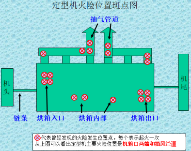 由下圖可知,定型機(jī)著火點(diǎn)主要集中在烘箱的進(jìn)出口和管道內(nèi)部,風(fēng)機(jī)拉風(fēng),火借風(fēng)勢,使得火勢蔓延起來非??欤葹?zāi)稍有延誤對印染企業(yè)就會造成不可挽回的損失。因此,如何將發(fā)現(xiàn)火情、熄滅火勢的時間壓縮到極致,是三鑫自動化重點(diǎn)突破的課題。