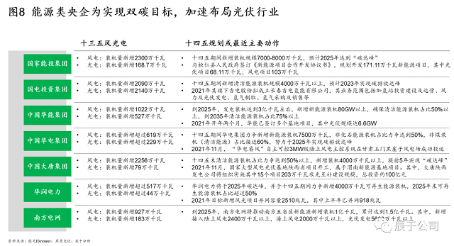 值得關(guān)注的是,為實(shí)現(xiàn)碳達(dá)峰碳中和,能源類央企加速布局光伏行業(yè),目標(biāo)宏大:例如國家能投集團(tuán)計(jì)劃“十四五”期間新增裝機(jī)規(guī)模7000-8000萬千瓦,預(yù)計(jì)2025年實(shí)現(xiàn)碳達(dá)峰;國電投資集團(tuán)則計(jì)劃“十四五”期間新增清潔能源裝機(jī)規(guī)模4000萬千瓦以上,預(yù)計(jì)2023年實(shí)現(xiàn)碳達(dá)峰(見圖8)。