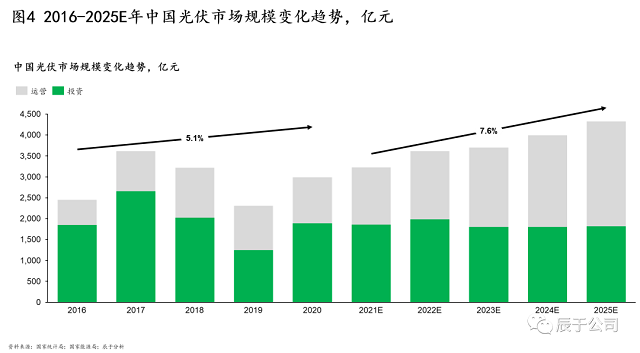 經(jīng)測(cè)算,辰于預(yù)計(jì)“十四五”期間我國光伏行業(yè)將保持7.6%的年復(fù)合增長,到2025年達(dá)到4300億元左右的市場規(guī)模,其中投資和運(yùn)營分別為1800億元和2500億元左右,相比平穩(wěn)發(fā)展的光伏投資市場,運(yùn)營市場增速更快(見圖4)。