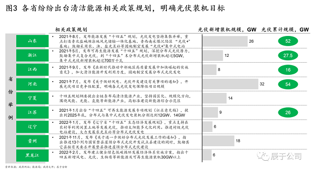 更加令人振奮的是,30·60雙碳風(fēng)口之下,我國光伏行業(yè)正迎來新的發(fā)展契機(jī),各省也在紛紛出臺(tái)光伏相關(guān)政策,明確光伏裝機(jī)目標(biāo),例如山東省在其能源發(fā)展“十四五”規(guī)劃中指出力爭到2025年末,光伏累計(jì)規(guī)模達(dá)到52GW,“十四五”期間省內(nèi)光伏新增裝機(jī)規(guī)模達(dá)26GW,相當(dāng)于翻了一番(見圖3)。