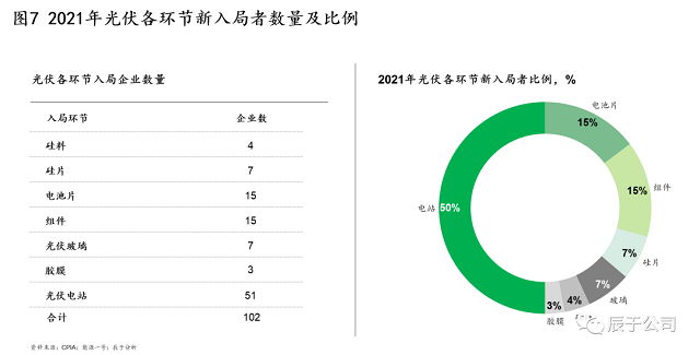 三是雙碳風(fēng)口下,更多跨界進(jìn)入者對(duì)光伏行業(yè)虎視眈眈。據(jù)統(tǒng)計(jì),2021年有100多家企業(yè)新入局光伏行業(yè),涉及各環(huán)節(jié),這些企業(yè)主要分為三類,包括傳統(tǒng)光伏企業(yè)擴(kuò)充業(yè)務(wù)范圍、相關(guān)企業(yè)進(jìn)入(例如玻璃企業(yè))、完全跨界者,其中光伏電站、組件、電池片最受關(guān)注,新入局企業(yè)數(shù)量分別占全部的50%、15%、15%(見圖7)。